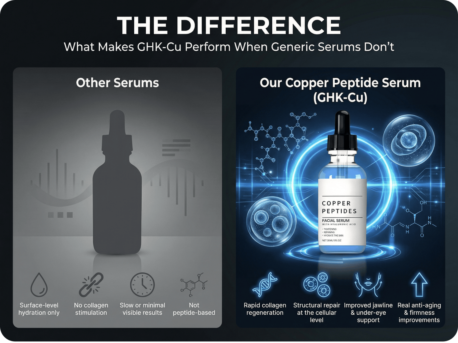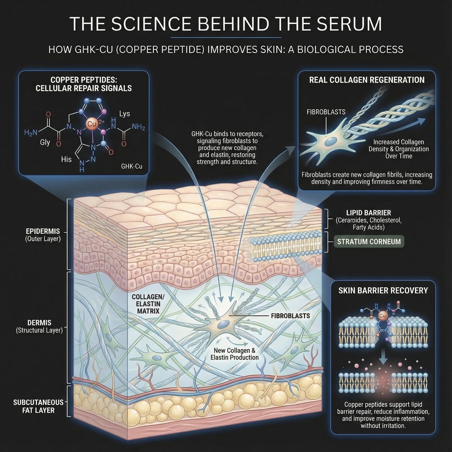 GHK-Cu is one of the few compounds proven to trigger new collagen production, not just hydrate the surface. This is real structural improvement.